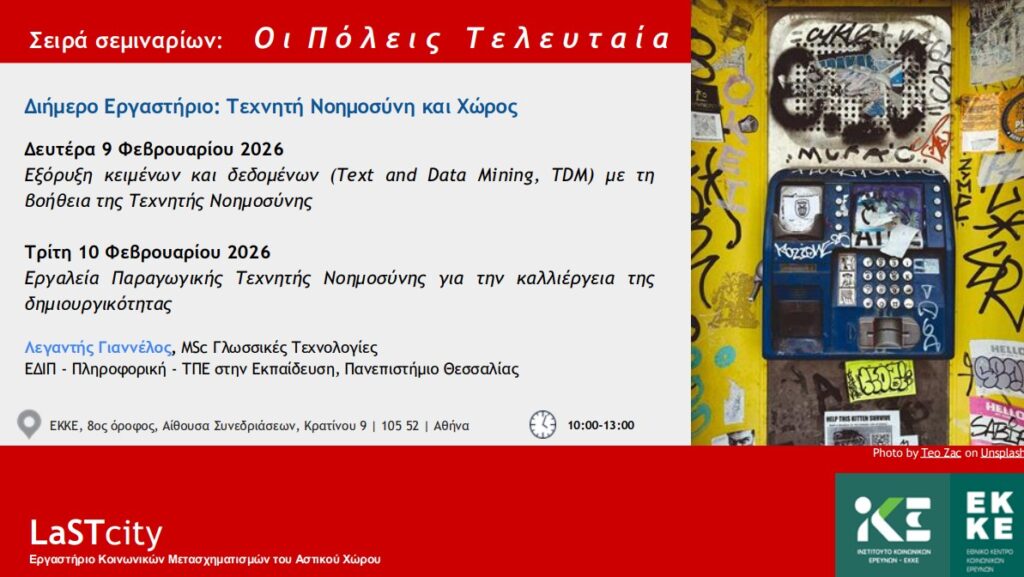 Το σεμινάριο Οι Πόλεις Τελευταία του LaSTcity ξεκινά με το διήμερο εργαστήριο «Τεχνητή Νοημοσύνη και Χώρος», στις 8 και 9 Φεβρουαρίου 2026. Εισηγητής είναι ο Λεγαντής Γιαννέλος, MSc Γλωσσικές Τεχνολογίες, ΕΔΙΠ – Πληροφορική – ΤΠΕ στην Εκπαίδευση στο Πανεπιστήμιο Θεσσαλίας.