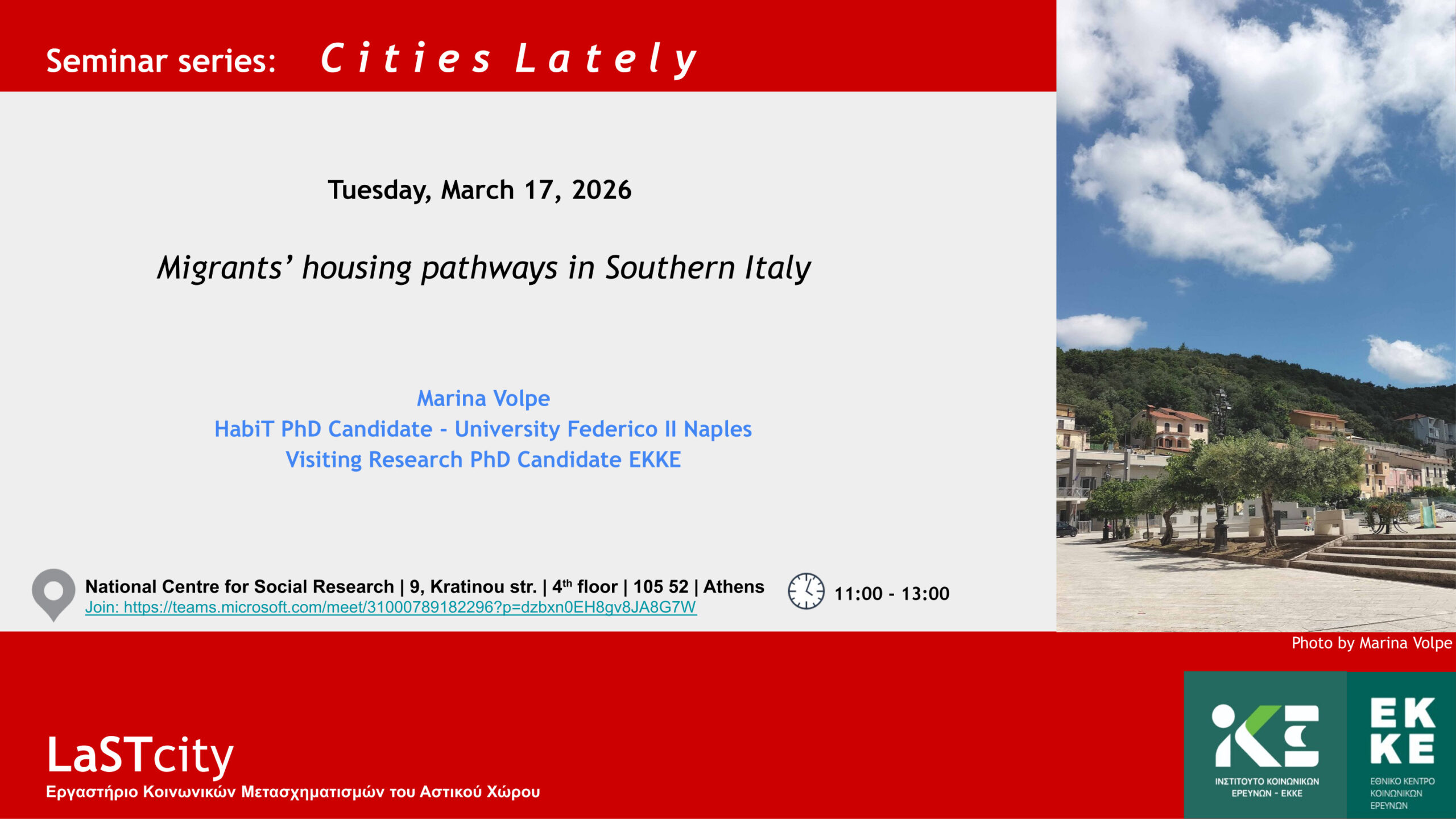 Η παρουσίαση της Marina Volpe εντάσσεται στη σειρά σεμιναρίων του LaSTcity του ΕΚΚΕ η οποία έχει στόχο να συμβάλει στον σύγχρονο διάλογο για τις πόλεις, ως τόπους που δεν παύουν να αλλάζουν. Στα σεμινάρια συζητάμε με ερευνητές και ερευνήτριες από την Ελλάδα και το εξωτερικό για τα μεταβαλλόμενα αστικά τοπία και τις δυναμικές επιπτώσεις τους στην κοινωνική οργάνωση και την κοινωνική ζωή. Θέτουμε ερωτήματα για τις νέες ανισότητες, διαχωρισμούς και εκτοπισμούς, για τον αναπροσδιορισμό των ορίων της πόλης και της σχέσης της με τη φύση, για την οικονομία της πόλης και τις μορφές της κρίσης της, για τη χωρική δικαιοσύνη και τις μορφές της διεκδίκησής της, για τις νέες διαδικασίες παραγωγής του δομημένου περιβάλλοντος, για θεσμούς και μηχανισμούς χωρικού σχεδιασμού και αστικής διακυβέρνησης. Για τις πόλεις που ασφυκτιούν, τις πόλεις που ανασαίνουν και για οτιδήποτε… μετασχηματίζεται (και πάλι) στις πόλεις τελευταία.