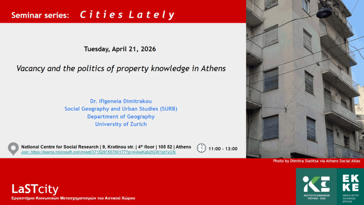Η παρουσίαση της Ιφιγένειας Δημητράκου εντάσσεται στη σειρά σεμιναρίων του LaSTcity του ΕΚΚΕ η οποία έχει στόχο να συμβάλει στον σύγχρονο διάλογο για τις πόλεις, ως τόπους που δεν παύουν να αλλάζουν. Στα σεμινάρια συζητάμε με ερευνητές και ερευνήτριες από την Ελλάδα και το εξωτερικό για τα μεταβαλλόμενα αστικά τοπία και τις δυναμικές επιπτώσεις τους στην κοινωνική οργάνωση και την κοινωνική ζωή. Θέτουμε ερωτήματα για τις νέες ανισότητες, διαχωρισμούς και εκτοπισμούς, για τον αναπροσδιορισμό των ορίων της πόλης και της σχέσης της με τη φύση, για την οικονομία της πόλης και τις μορφές της κρίσης της, για τη χωρική δικαιοσύνη και τις μορφές της διεκδίκησής της, για τις νέες διαδικασίες παραγωγής του δομημένου περιβάλλοντος, για θεσμούς και μηχανισμούς χωρικού σχεδιασμού και αστικής διακυβέρνησης. Για τις πόλεις που ασφυκτιούν, τις πόλεις που ανασαίνουν και για οτιδήποτε… μετασχηματίζεται (και πάλι) στις πόλεις τελευταία.